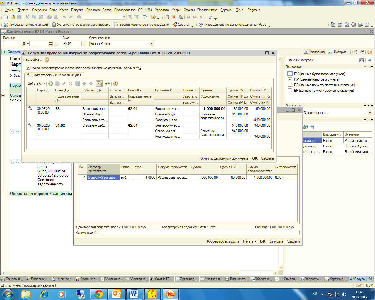 Для этого в результате проведения документа «Корректировка долга» нужно установить флаг «Ручная корректировка» в проводке Дт 63 Кт 62.01 по налоговому учету установить сумму покрытую резервом, а остаток по по дебету отнести в постоянные разницы, а по кредиту во временные.
