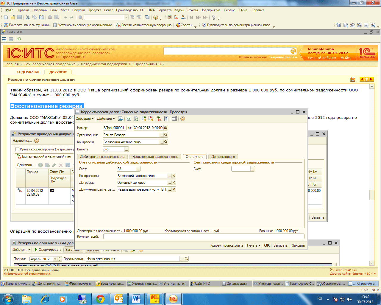 В рассматриваемом примере, при закрытии апреля произойдет восстановление резерва. В нашем случае долг погашен полностью, поэтому восстановление резерва произойдет в размере той суммы, которая была начислена ранее.