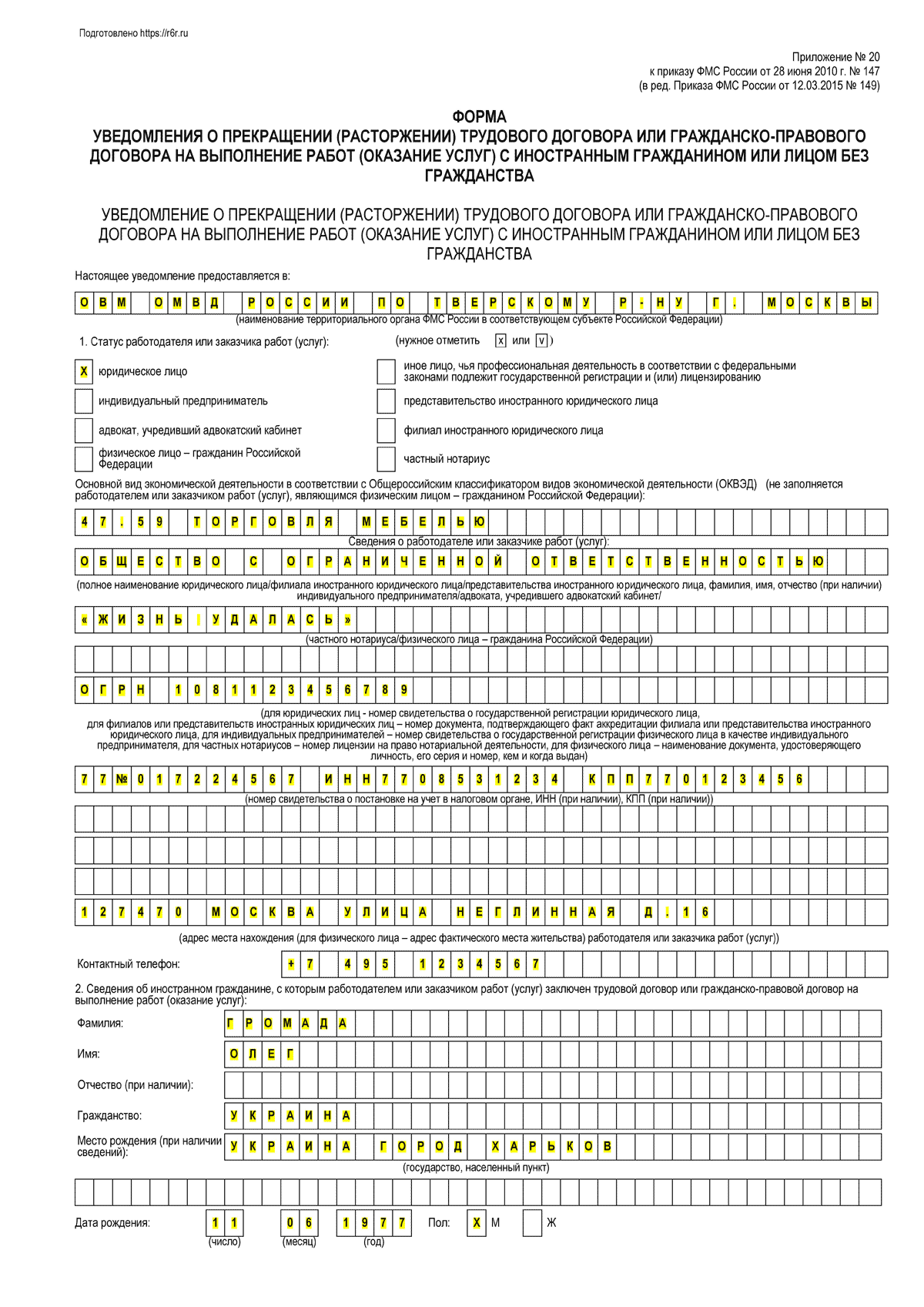 Уведомление о расторжении трудового договора или гражданско-правового договора на выполнение работ (оказание услуг) с иностранным гражданином, прибывшим в РФ в порядке не требующем получения. СКАЧАТЬ